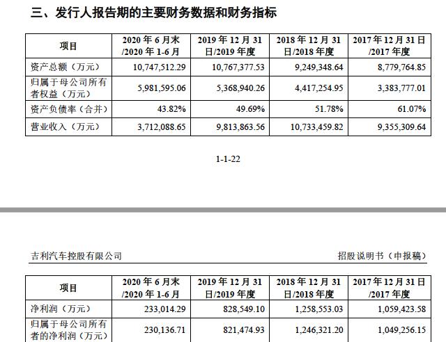 招股书显示,吉利汽车此次初始发行的股份数量不超过17.31亿股,不超过公司审议本次发行上市的董事会召开前一日(即2020年6月23日)已发行股份总数及本次发行的人民币股份数之和的15%。