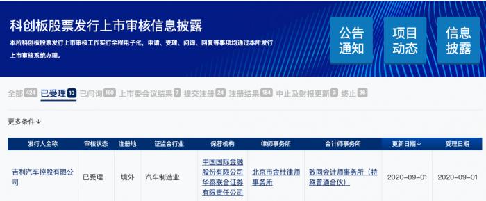 9月1日,上交所官网显示,吉利汽车控股有限公司科创板上市申请获得上交所受理,与此同时,其披露了招股书。
