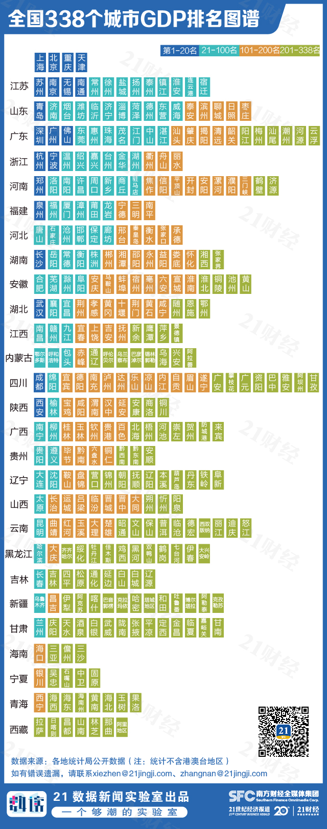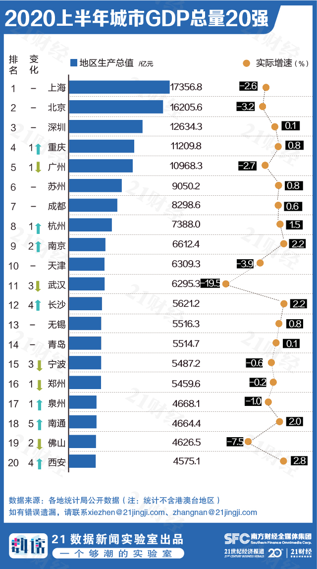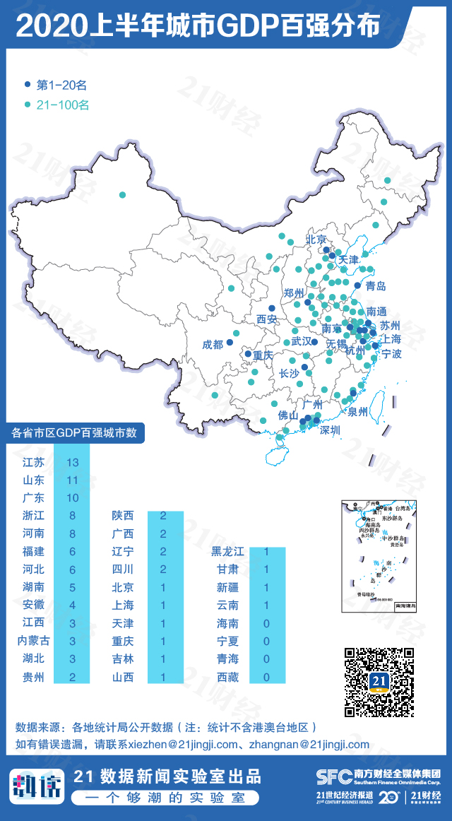 21数据新闻实验室统计338个城市(包括州、地区、盟,港澳台未计入,下文皆以城市统称)上半年经济数据,得出“2020年上半年城市GDP百强榜”。(点此H5查询器>>>最新中国城市GDP排行榜:你的家乡排第几?)