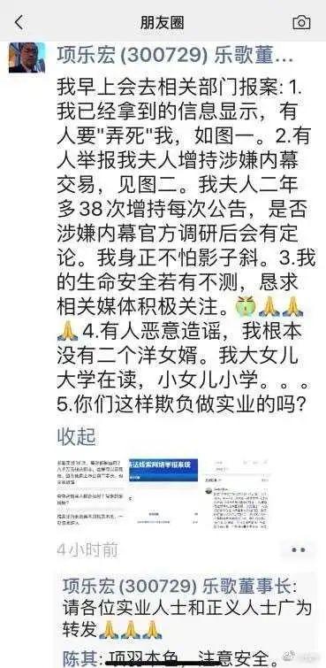 9月1日,乐歌股份董事长项乐宏在朋友圈发布消息,称有人要“弄死”他,表示他将报案。