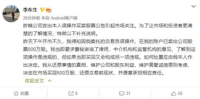 今日,TCL董事长李东生在微博发文称,“昨天下午开市不久,我得知因我委托的交易员误操作,在我的账户已卖出公司股票500万股。我当即要求董秘咨询了律师,中介机构和监管机构的意见,了解到这项操作是违规的,但如果当即买回又会构成另一项违规。如何处置应由我本人作出决定。我从还原事情的真相,维护公司和股东利益,维护高管诚信原则考虑,决定在市场买回500万股,还原交易前现状,并愿意承担相应责任。”
