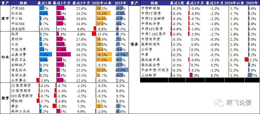 再通胀交易逐渐升温。最近一个月以来国内金融市场走势表现为,股票市场在以消费板块为主力的拉动下继续上涨,商品价格持续反弹,黄金价格明显调整,以利率债为代表的债券市场再次下跌。(1)从行业角度来看,“主要消费”板块超过“医药卫生”成为年度涨幅最大的行业,很可能意味着从股票市场角度来看,行情主线正在从“疫情影响”切换成“需求恢复”;(2)债市出现加速下跌迹象,长债跌幅大于短债,利率债的跌幅大于信用债。尽管供给和流动性的影响占主要因素,但是债市的这种“跌法”确实有隐含通胀预期的嫌疑;(3)部分商品价格开始出现上涨行情,整体工业品正在“需求恢复”和“生产趋缓”的短期供需影响下逐渐“补涨”(年度角度来看,大类资产中工业品整体涨幅最小)。
