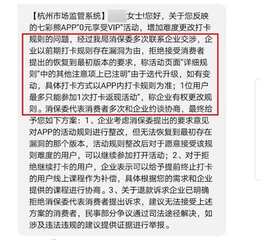 杭州消协曾多次与七彩熊交涉,但最终结果是:七彩熊拒不退款,对于更改规则,他们能够自圆其说,这种经营上的违规,工商权责不到,消协无能为力,建议走司法渠道。