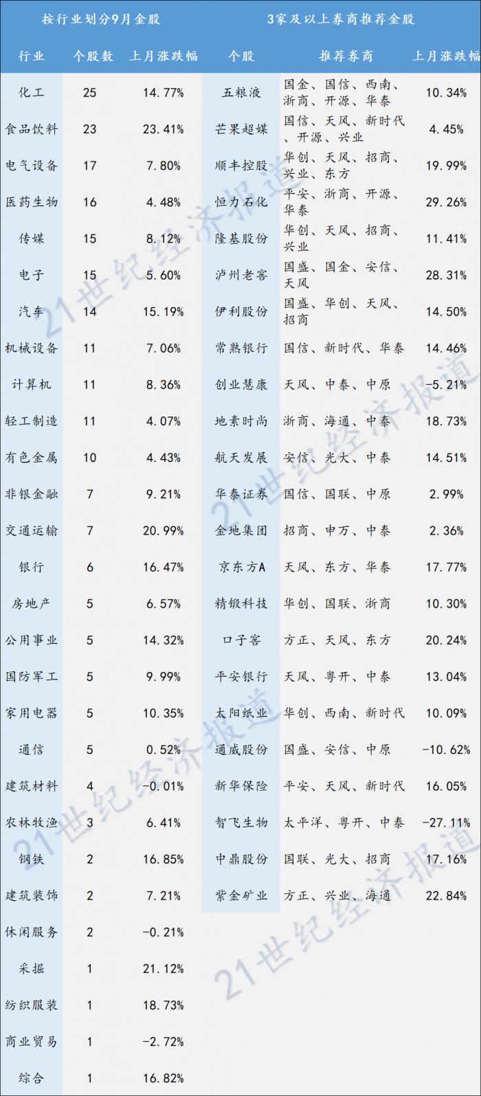 9月,26家券商一共推荐了230只金股,其中,金股最多的行业是化工行业,共有25只金股;紧随其后的就是食品饮料行业,共有23只金股;电气设备行业位列第三,共有17只金股。