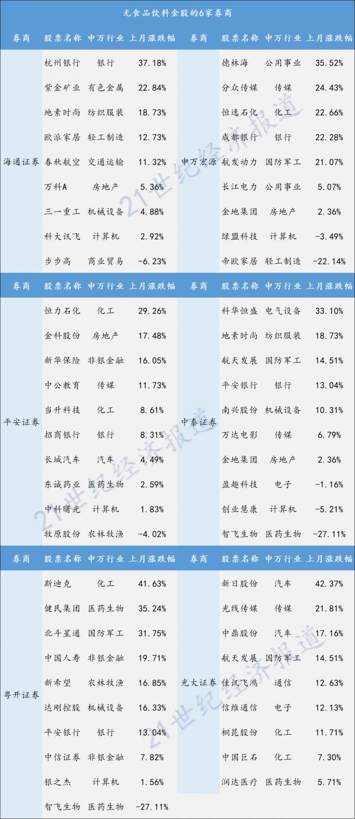 并不意外,这6家券商更偏爱寻找周期的机会——化工、大金融、房地产、机械制造等行业成为金股重点覆盖对象。