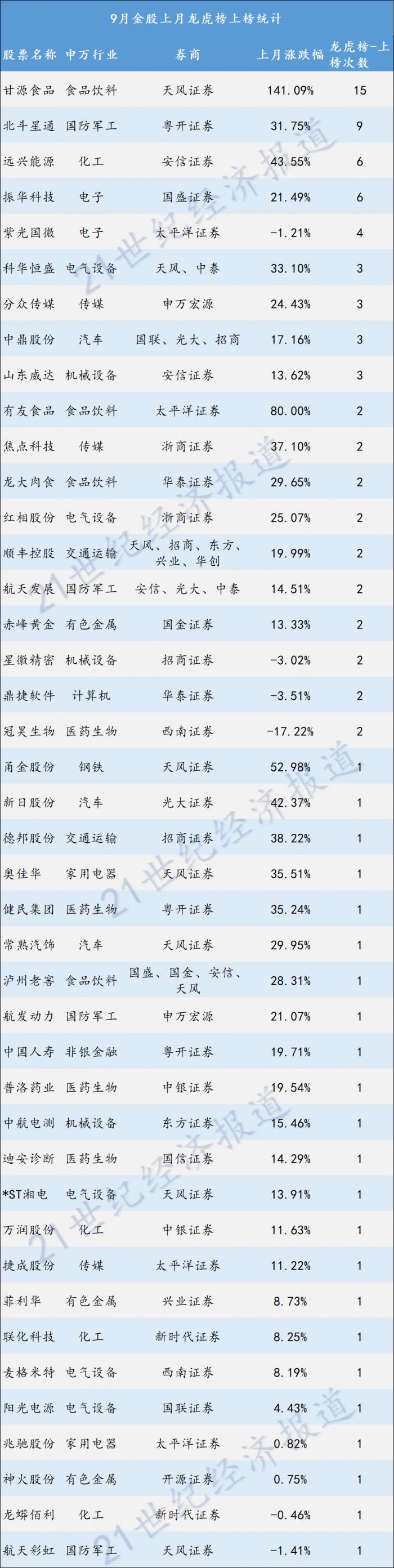 由于月度金股几乎是每月一换,也就存在短期效应,更容易多次登上龙虎榜。在9月的230只金股中,有43只金股上个月登上龙虎榜,登榜次数最多的是天风证券推荐的甘源食品,8月共15次登上龙虎榜。