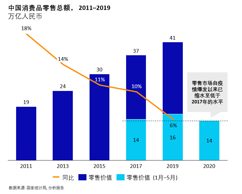 中国的消费品零售市场自2011年起就已进入增速下降的新时代。中国消费品零售总额的年增长率从2011年18%的增速逐年下降至2019年的6%。
