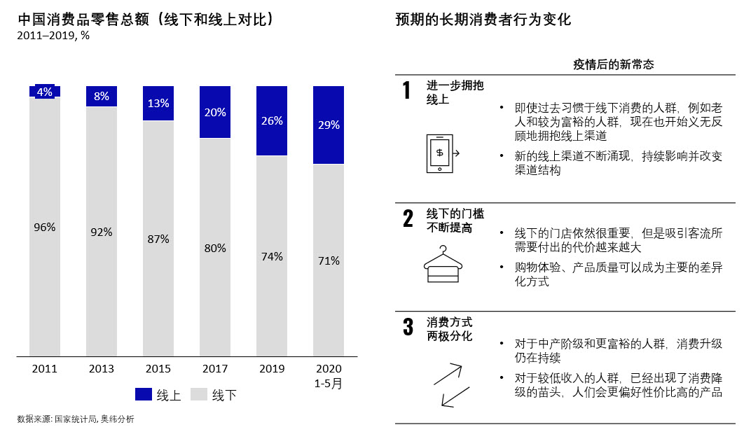 另一方面,尽管线下门店仍具有不可替代的作用,但吸引客流量的标准却越来越高。我们的调研显示,消费市场或将出现进一步的两极分化——对于中高收入消费人群,消费升级仍在持续,而对于较低收入的消费者,消费降级的苗头开始显现。
