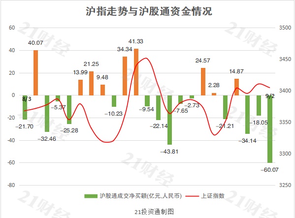 北向资金全天净卖出66.14亿元,其中沪股通净卖出超60亿元,深股通卖出6.07亿元。据21投资通统计发现,北向资金已连续3日净流出,加上此前8月31日、9月1日的净流出额80.26亿元,3亿元,合计149.4亿元。