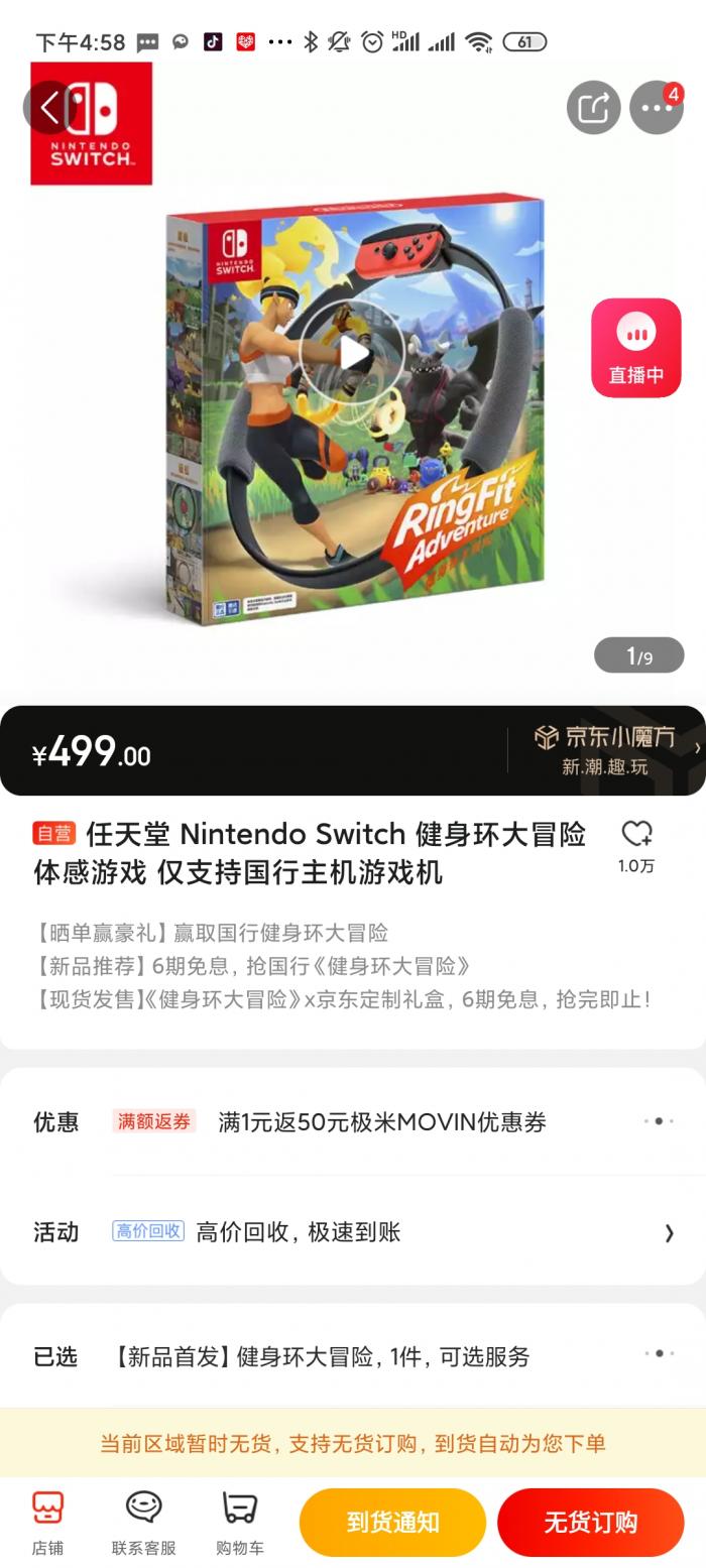 9月3日,由腾讯代理的国行版 Nintendo Switch 游戏《健身环大冒险》在天猫商城和京东开售,上架仅半天时间就销售一空。