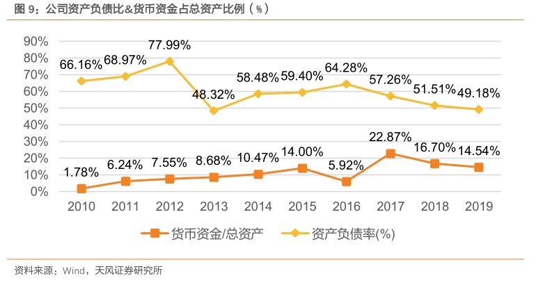 资本结构稳定,资金充裕为资金链提供较高安全边际。从资产负债率来看,公司近5年来在49%到65%之间,波动幅度较先前已大幅收窄,公司资本结构逐渐趋于稳定。同时,公司账面现金占比整体呈上行趋势,资金充裕为公司贸易业务资金链提供了较高的安全边际。
