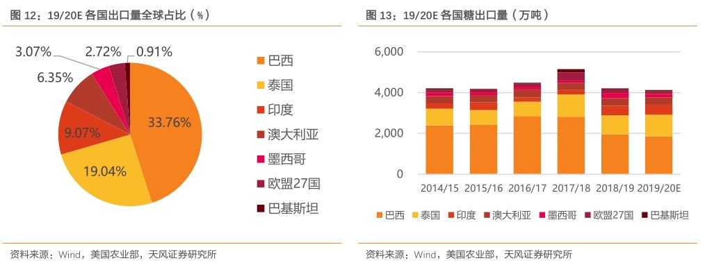 全球前三大糖出口国为巴西、泰国和印度,三国产量及出口量对全球糖供给量具关键影响力。2019/2020年预估全球糖出口量约为5514.8万吨,三者占比分别为33.76%、19.04%、9.07%;全球前四大产糖国家/地区为印度、巴西、欧盟27国、泰国。2019/2020年预估全球糖产量约为1.74亿吨,四者占比分别为19.07%、16.4%、9.86%和8.11%。从出口量占产量比看:泰国、巴西出口量占产量比分别高达77.55%、63.44%。
