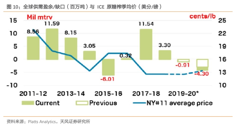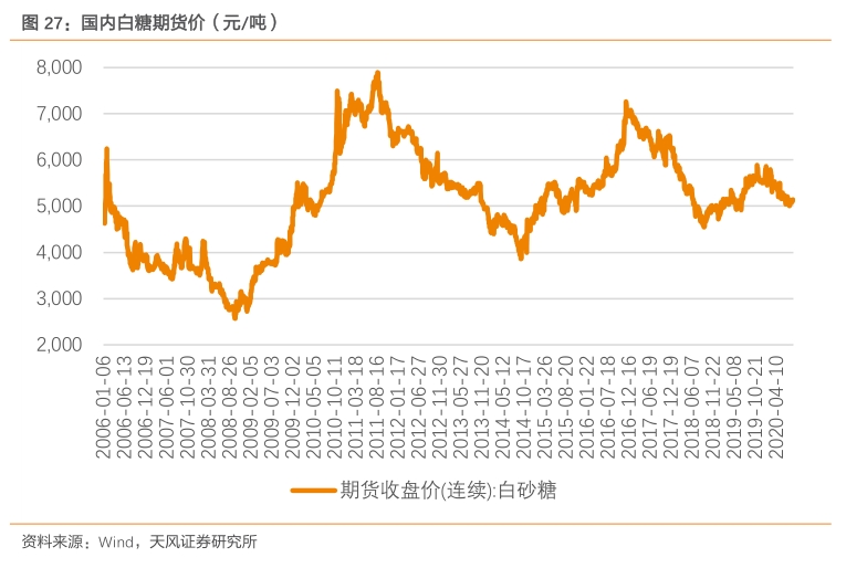 全球糖价历史底部于2020年4月底已出现。根据Platts数据,整体来看,外盘糖价自2011/12榨季后一路下行,国际市场库存随之调整,至2015/16榨季时已产生约600万吨的供需缺口,此时糖价出现短暂企稳回升,带动供应量上升,至2018/19榨季,全球白糖供应量已达1154万吨。由于供给量严重过剩,此后国际白糖市场进入去库存阶段,外盘糖价随之再次下行。2020年初,疫情全球爆发导致糖整体需求量下降,使短暂的价格抬升至约15美分/磅后再次跌至底部。ICE11号原糖主力合约收盘价最低跌至9.37美分/磅,跌破2014/15榨季10.13美分/磅的历史低位。