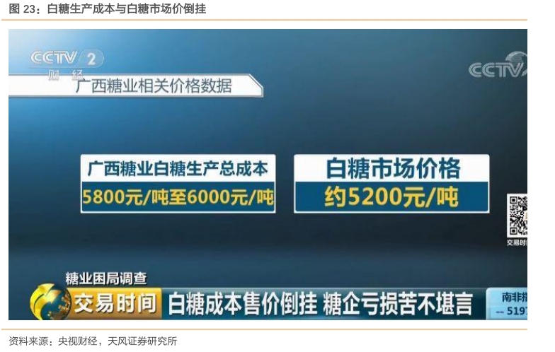我国制糖成本常年高于现货价。我国食糖行业发展面临的主要困境在于成本过高,其中,生产成本过高导致糖料生产可替代性高,糖料生产竞争力有限;加工技术落后导致加工成本较高,加工产品单一,制糖加工竞争力不足;食糖成本过高导致国内糖价居高不下,国内糖价与国际糖价价差较大,国内食糖消费竞争力不强。根据央视财经2019年数据,以广西糖业为例,其生产总成本在5800到6000元/吨之间,但当时白糖市场价格仅为5200元/吨左右。根据2020年8月24日数据,白糖现货价为5310元/吨,可见价格倒挂问题长期存在并非常严重。
