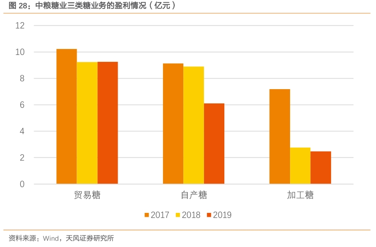 公司目前拥有贸易糖、自产糖、加工糖三类业务,通过对三类糖业务进行调整组合可有效应对内外糖价走势变换风险,穿越糖价周期,提升公司业绩。目前来看,国内糖价呈现下行趋势,若内外价相差较大或价差进一步扩大,将提升公司贸易糖和加工糖业务盈利水平。2017-2019年,公司糖贸易业务盈利相对稳定,毛利在9-10亿元左右,2017年国内糖价较高时,公司贸易糖毛利达到10.2亿元,相对后两年较高;而若国内糖价受外盘糖价上行趋势影响,未来反转当前走势,则也会使公司在贸易糖业务的基础上,提升自产糖和加工糖业务盈利能力。公司自产糖在2017-2019年毛利分别为9.1亿、8.9亿和6.1亿;加工糖在2017-2019年毛利分别为7.2亿、2.8亿和2.5亿2019年公司国内外原糖产能合计100万吨,假设成本不变,国内糖价上涨1000元/吨,则原糖业务毛利增加10亿元。