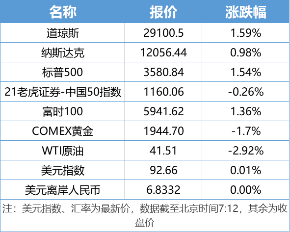 美国三大股指集体收涨。道指涨超450点收复29000点关口,纳指首次收于12000点上方,携手标普500指数共创收盘历史新高。腾讯概念及新能源车股集体走低,特斯拉大跌5.83%。