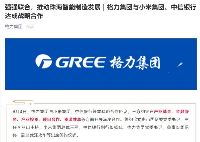 近日,格力集团微信公众号发布消息确认,格力集团与小米集团(01810.HK)、中信银行(601998.SH)签署战略合作协议,三方约定在产业基金、金融服务、产业投资、项目合作、资源共享等方面开展深度合作。