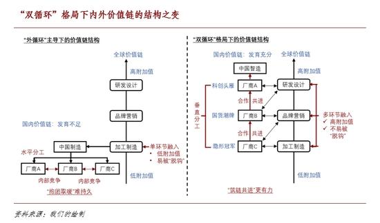 面向“双循环”新格局,中国内外价值链结构有望迎来新一轮变革。国内价值链料将加速发展,形成更具深度和效率的垂直分工体系。基于此,中国经济有望从“以环入链”转向“以链入链”,与全球体系缔结更为多元的纽带。中国企业有望从“抱团取暖”转向“筑链共进”,从三大途径同步加快产业升级步伐。在这一场大变革中,“科创头雁”“国货潮牌”和“隐形冠军”三类中资企业有望实现长趋势崛起,逐步兑现内外变局所赋予的时代红利。详情>>>