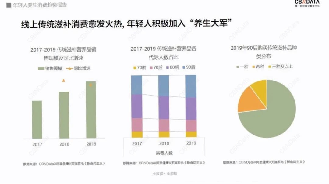 根据CBNDATA发布的《年轻人养生消费趋势报告》,接近九成以上的年轻人已有养生意识,且“食补潮流进行时”作为三大养生大法里的重要方式,年轻人开始购买即食型的滋补产品。和传统概念上的养生方式不同,年轻人对养生产品的科学性、便捷性和滋补特性也更加看重。
