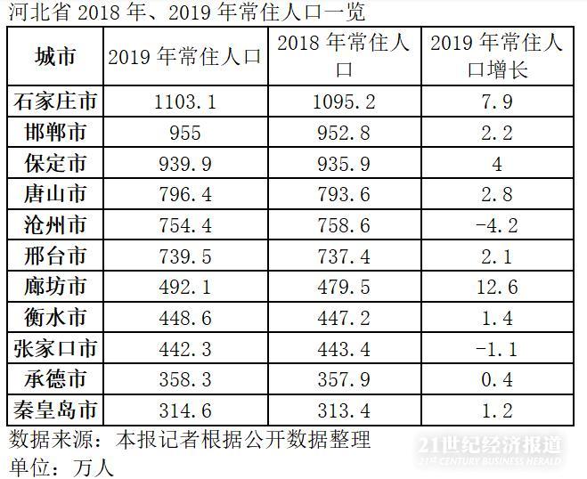 河北的11个地级市,石家庄 、邯郸、 邢台、 保定、张家口、 承德、 唐山、 秦皇岛 、沧州 、衡水 、廊坊,只有靠近北京的廊坊,由于北京落户政策较严而人口“外溢”,出现常住人口增长超过10万人,其他城市无一个常住人口增速超过10万人,有5个在0-3万之间,2个城市为负增长。
