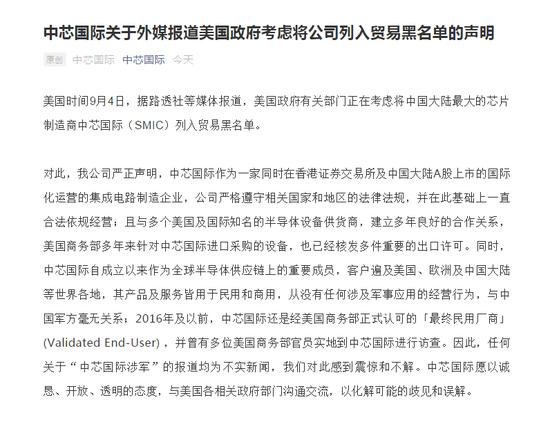 中芯国际微信公众号9月5日发布声明,美国时间9月4日,据路透社等媒体报道,美国政府有关部门正在考虑将中国大陆最大的芯片制造商中芯国际(SMIC)列入贸易黑名单。