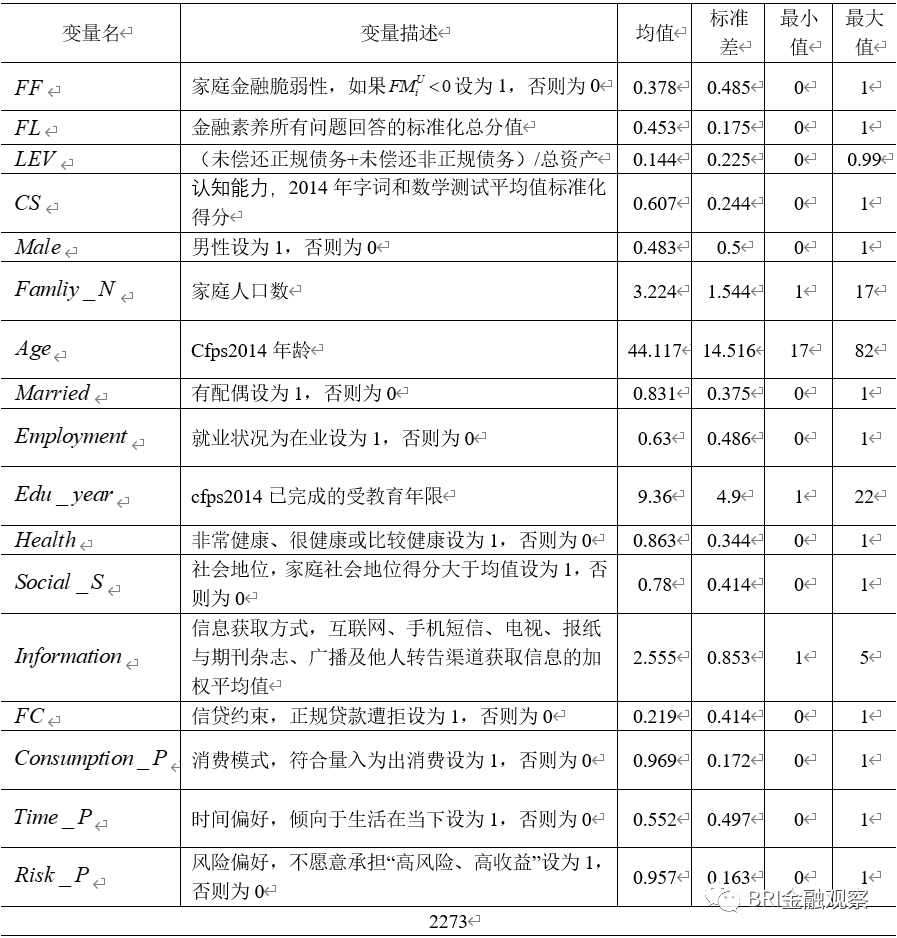 本文使用的数据主要来自于2014年中国家庭追踪调查数据库(China FamilyPanelStudies)。CFPS2014新增了“金融知识模块”,该模块涉及到家庭主要财务管理者的基础金融知识、高级金融知识以及财务管理、解决财务问题技能等与金融素养有关的信息。此外,还包括了16岁以上成人的认知能力测试、个人主观态度、手机和网络使用情况、行为与精神状态、受教育程度等个人特征,以及家庭资产负债状况、拖欠贷款和账单情况、家庭规模与人口结构等相关信息。在数据整理中,删除家庭资产不足1万元以及资产大于1亿元、家庭总收入小于等于0的样本,同时剔除了一些异常值和缺失值,最终得到有效样本规模为2273个。