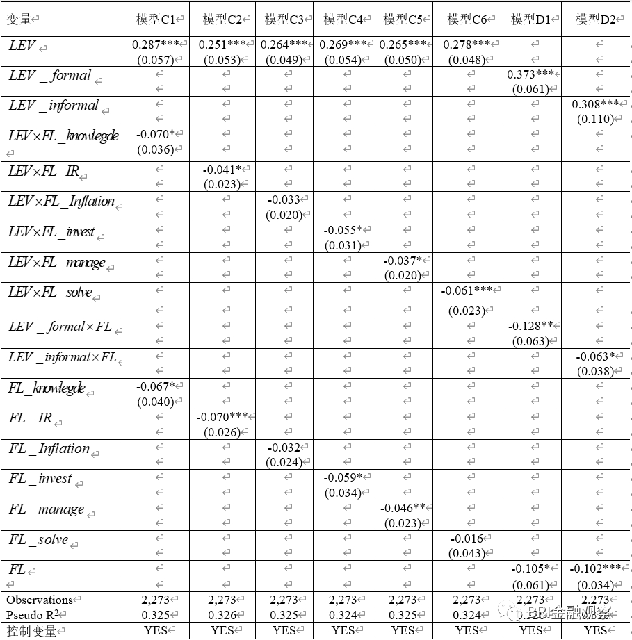金融素养在缓解正规信贷渠道债务杠杆和非正规借贷渠道债务杠杆对家庭金融脆弱性的不利影响中,存在重要区别。由于正规金融与非正规金融的合约订立和执行程序不同,金融素养对于不同类型债务杠杆对家庭金融脆弱性影响的调节效果也将存在差异。一方面,由于正规金融以一整套标准化、程序化的方法,包括利率、数量、违约条款等,来确立贷款合同,并以正规的合同和有效的法律机制来确认合约执行(La Porta et al, 2002),金融素养的局限将影响对正规合同信息识别和应对的效率。 另一方面,非正规金融一般不做标准化和程序化的度量,而是通过社会网络,如人际地缘关系、商业联系等,来建立借贷关系,并在声誉、关系与社会制裁基础之上建立评估和监督机制(Hellman et al., 2008)。在这种社会网路传导机制下,金融素养对非正规借贷的调节效应可能较为有限。由此提出补充假设3。