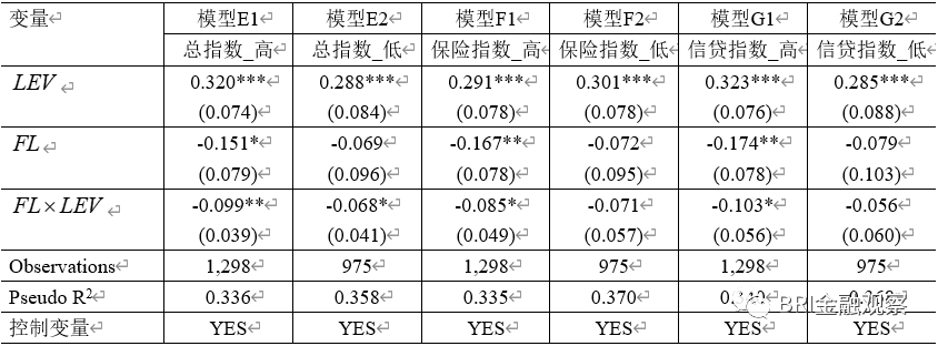 本文考虑数字金融服务体系发展在金融素养缓解杠杆对家庭金融脆弱性负向影响中所产生的作用。一方面,数字金融产品和服务存在技术上的排他性,在一定程度上需要较高的金融素养水平与之匹配;另一方面,数字金融的低门槛特征给居民家庭提供更有效率的金融产品以应对风险,使家庭对不确定性冲击所造成后果的可预期性更强。通过使用“中国数字普惠金融指数”及分类指数(谢绚丽等,2018),按照家庭所在省份数字金融环境指数是否高于中位数,将样本区分为数字普惠金融发展发达样本和数字普惠金融发展不发达样本,进行分组回归。