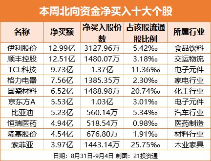 从北向资金增持最多的个股来看,本周面板巨头TCL科技、京东方A均进入前十。