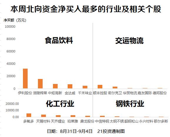 从行业上看,本周北向资金增持食品饮料、交通运输、化工等3行业市值超7亿元。酿酒行业、银行、农林牧渔、保险、医药制造、券商信托、软件服务、房地产、水泥建材这9大行业被大幅减持超10亿元。