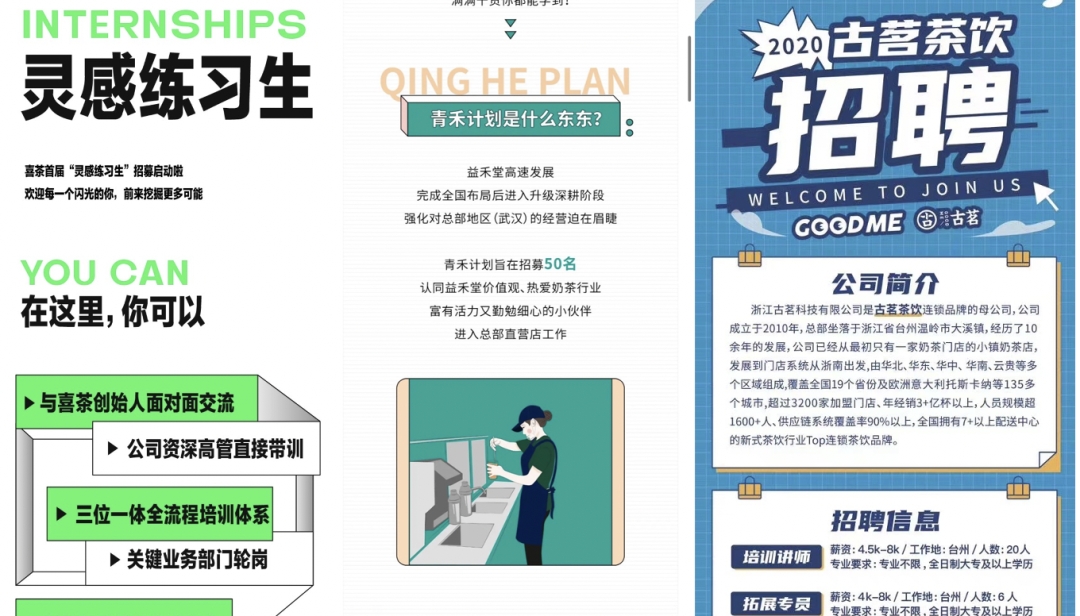 从目前发布的信息来看,不同茶饮品牌呈现出不同的招聘方向。比如喜茶通过校招招聘管培生,益禾堂及古茗则是通过社招的方式招聘店长、市场等等部门相关人才。