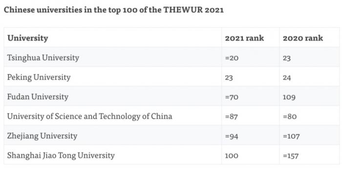进入前100名的中国大学从去年的3所增加到今年的6所