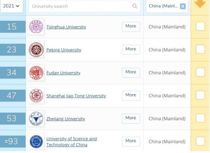 THE排名显示,除清华大学,还有5所大学入围百强,分别是北京大学、复旦大学、中国科技大学、浙江大学和上海交通大学。进入百强的中国大陆高校数量比去年翻了一番,再创新高。
