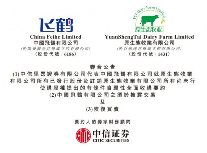 9月6日晚,中国飞鹤(06186.HK)与原生态牧业(01431.HK)联合发布公告称,飞鹤拟委托中信里昂向原生态牧业提出自愿性有条件现金要约,每股定价0.63港元,同时以现金换取注销所有尚未行使的购股权,股份要约的价值约为30.71亿港元。