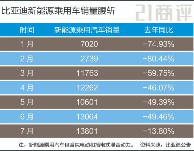 财报显示,上半年,比亚迪新能源乘用车(纯电动和插电式混合动力)销量为57449辆,同比骤降59%。