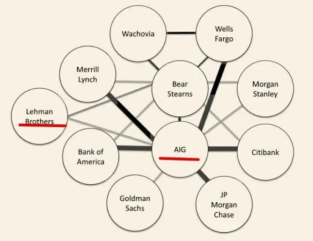 由图可知,AIG就处在这张关系网的中心位置、影响巨大,一旦AIG破产将引发多米诺骨牌效应——其他金融机构会接连破产、从而再冲击整个社会。