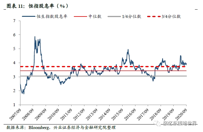 当前恒生指数的股息率为4.0%,高于上周的3.9%,高于2006年9月以来的3/4分位数。