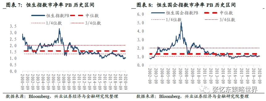 截至9月4日,恒指预测PE(彭博一致预期)为11.8倍,恒生国指预测PE为8.6倍,两者均处于2005年7月以来的1/4分位数和中位数之间。