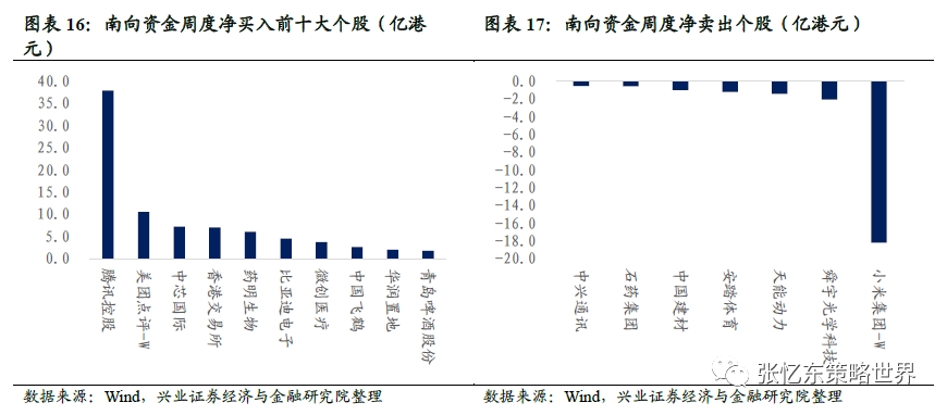 南向资金周度净买入前十大个股为腾讯控股、美团点评-W、中芯国际、香港交易所、药明生物、比亚迪电子、微创医疗、中国飞鹤、华润置地和青岛啤酒股份;净卖出个股为小米集团-W、舜宇光学科技、天能动力、安踏体育、中国建材、石药集团和中兴通讯。
