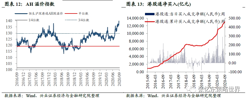 本周港股通成交占主板成交金额的比重为7.8%,低于上周的8.8%。截至9月4日,AH溢价指数为141.8,高于上周的140.6,高于2005年以来的3/4分位数,处于近四年以来的高位水平。