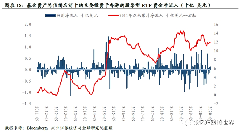 根据彭博口径统计,本周主要投资于香港的股票型ETF基金中,基金资产总值前十大ETF净流入资金12.1亿美元。