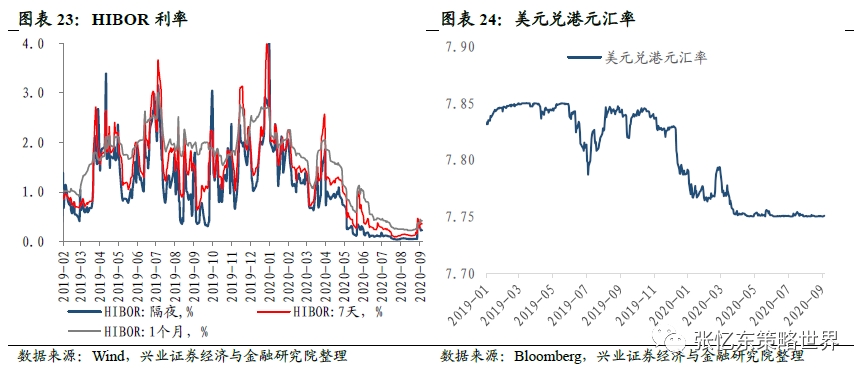 货币市场利率:截至9月4日,相较于上周五,本周HIBOR隔夜利率下降12bp至0.23%,7天利率下降11bp至0.36%,1个月利率上升5bp至0.42%。