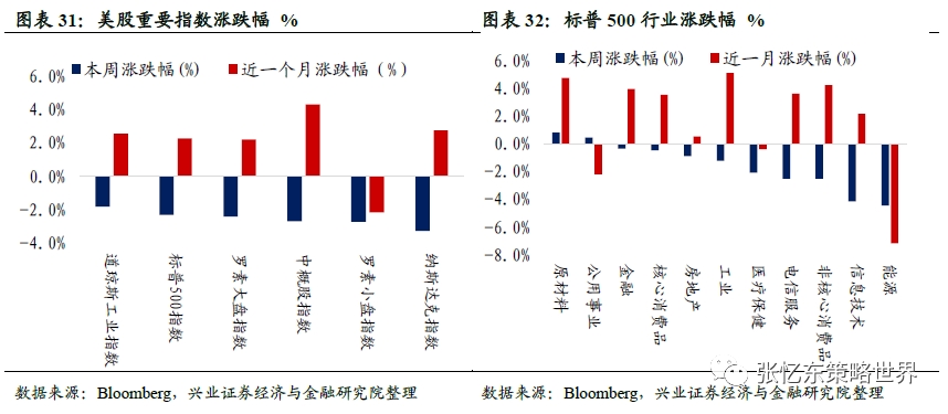 股指表现。本周,美股重要指数全部下跌,纳斯达克指数(跌3.3%)、罗素小盘指数(跌2.7%)和中概股指数(跌2.7%)领跌,其余指数中,罗素大盘指数跌2.4%,标普500跌2.3%,道琼斯工业指数跌1.8%。行业上,仅原材料(涨0.8%)和公用事业(涨0.4%)上涨,能源(跌4.5%)、信息技术(跌4.2%)和非核心消费品(跌2.5%)领跌。