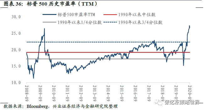 标普500市盈率(TTM)为26.7倍,低于上周五的27.3倍,高于1990年以来的3/4分位数。