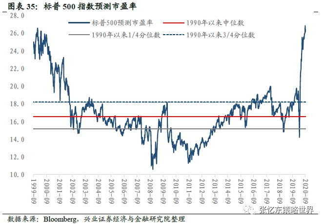截至9月4日,标普500预测市盈率为26.2倍,低于上周五的26.9倍,高于1990年以来的3/4分位数。互联网泡沫时期,标普500指数于2000年3月24日攀升至当时最高点1527.5点,当日标普500预测市盈率为26.3。当前标普500指数预测市盈率接近于互联网泡沫时期预测市盈率的高值。