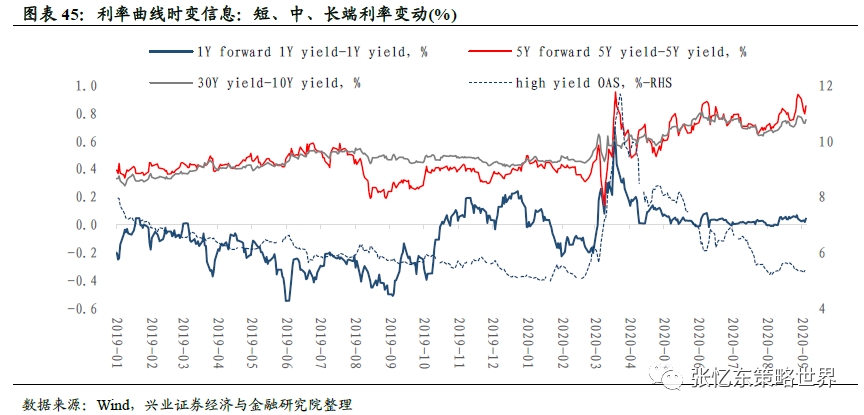 (注:短期货币政策预期,即1Y forward 1Y yield-1Y yield,指的是1年后的1年期国债到期收益率与当前时点1年期国债到期收益率的差,反映了短期(1年期)货币政策预期。同理,5Y forward 5Y yield-5Y yield(中期增长和通胀预期)指的是5年后的5年期国债到期收益率与当前时点5年期国债到期收益率之差,反映中期增长和通胀预期。)