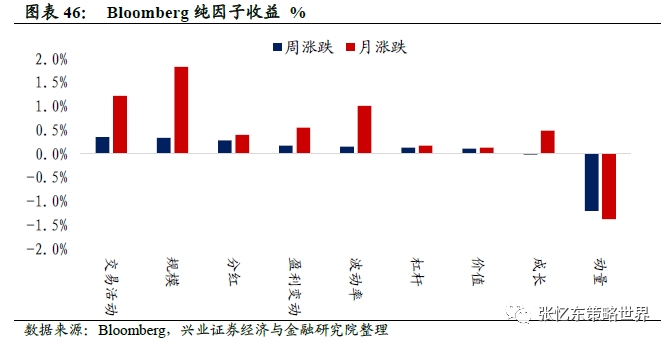 本周,交易活动(涨0.34%)、规模(涨0.33%)和分红(涨0.28%)因子领涨;仅有动量(跌1.2%)和成长(跌0.02%)因子下跌。近一月,规模和交易活动因子占优,动量因子跑输。