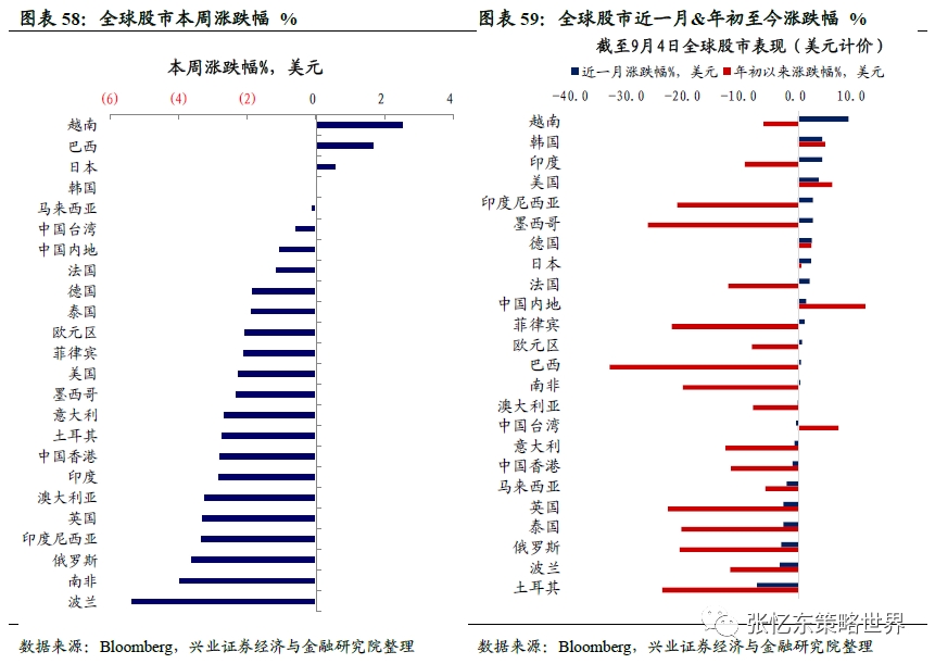 2) 股票市场:本周越南(涨2.6%)、巴西(涨1.7%)和日本(涨0.6%)领涨,波兰(跌5.4%)、南非(跌4.0%)和俄罗斯(跌3.7%)领跌;