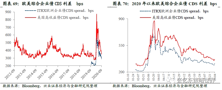 欧美综合企业债CDS利差:相较于上周收盘,欧洲企业债CDS上升2.7bps至309.2bps;美国高收益债CDS下降2.0bps至366.5bps。