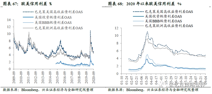 欧美企业债信用利差。截至9月4日,相较于上周收盘,巴克莱美国高收益债利差OAS上升13bp至4.9%,美国投资级债利差OAS下降2bp至1.4%,美国BBB级债利差下降3bp至1.0%,巴克莱欧洲高收益债利差OAS下降9bp至4.4%。